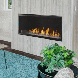 The sleek look of this linear fireplace can be added nearly anywhere, warming your home with 99.9 percent efficiency. The final touches are the shimmering fireglass and accent lighting that transform this sleek fireplace into an eye-catching show.