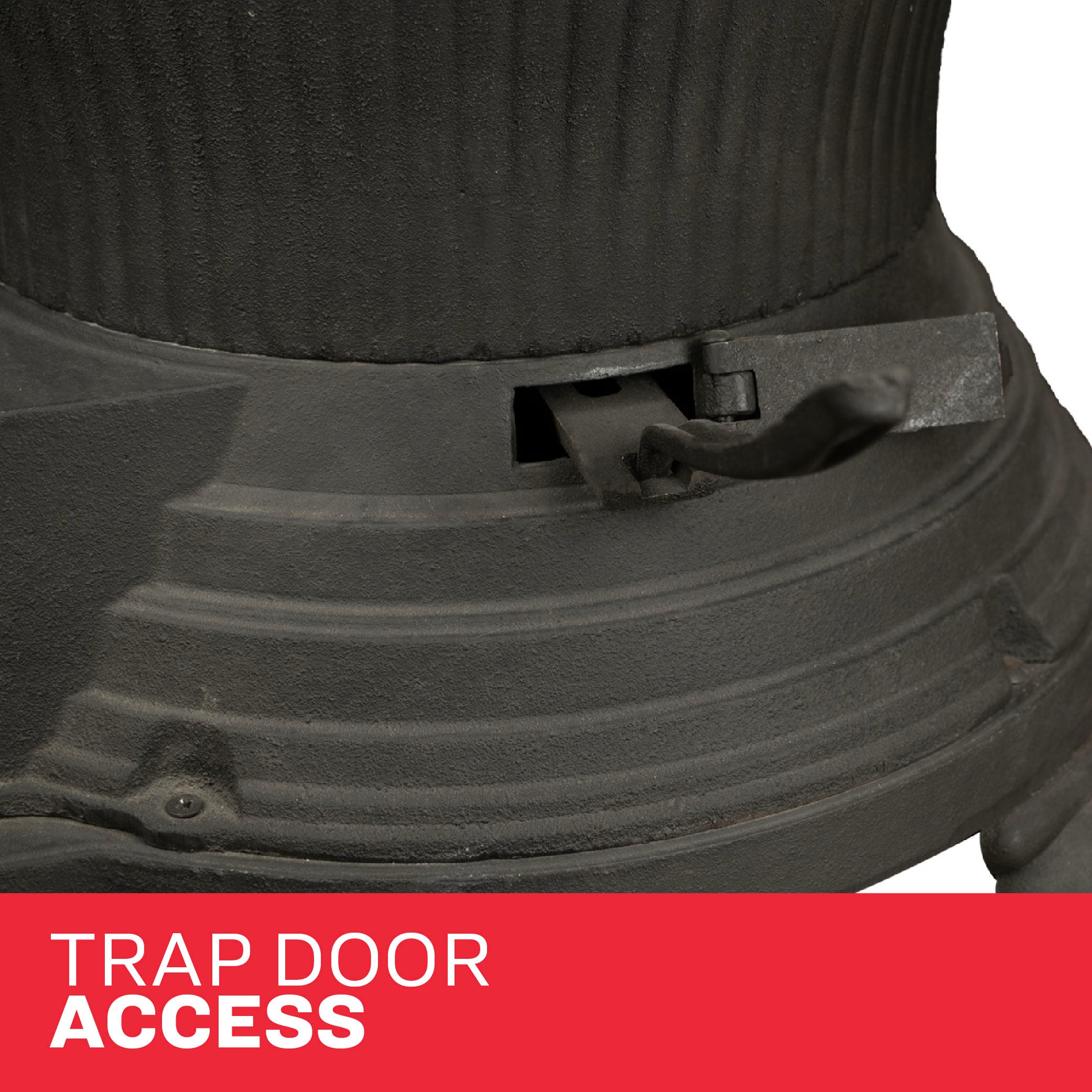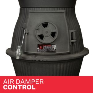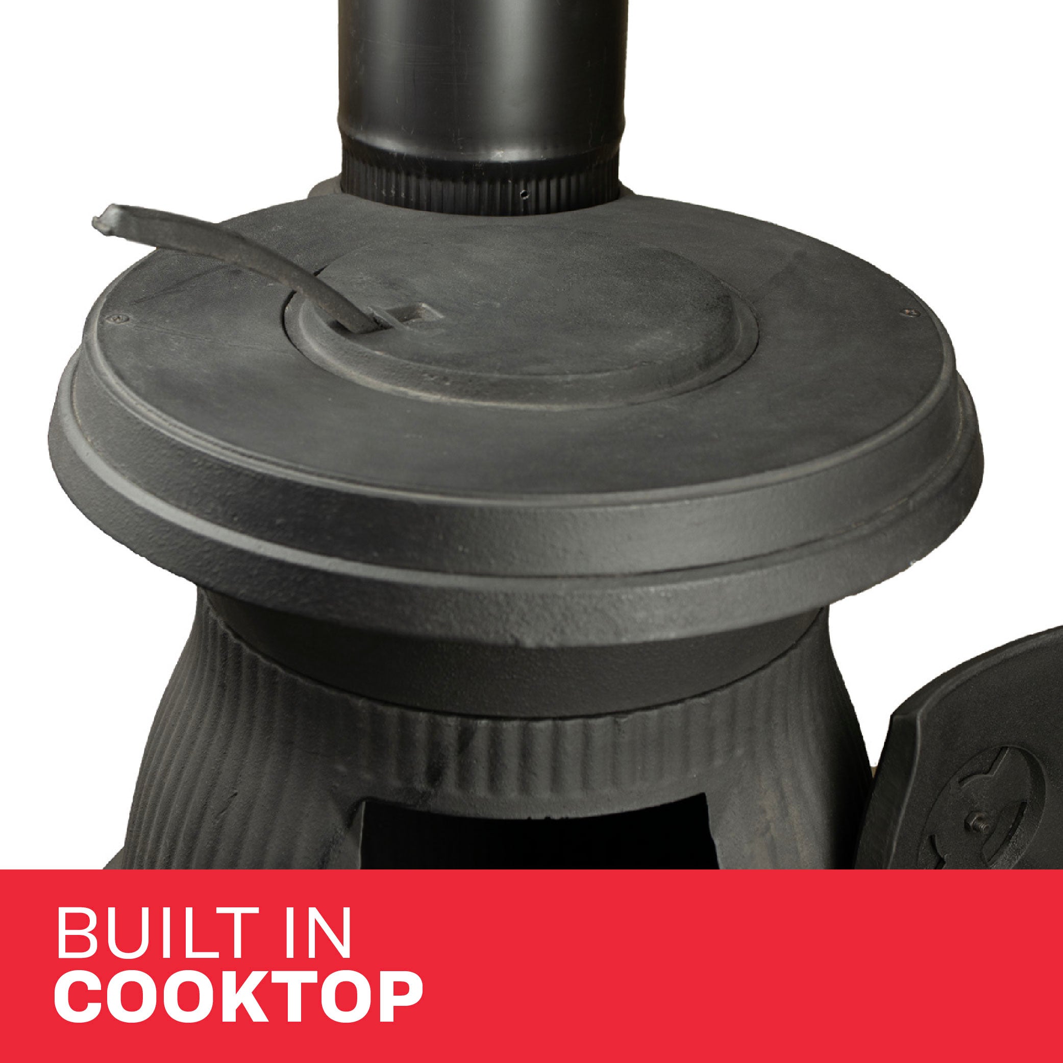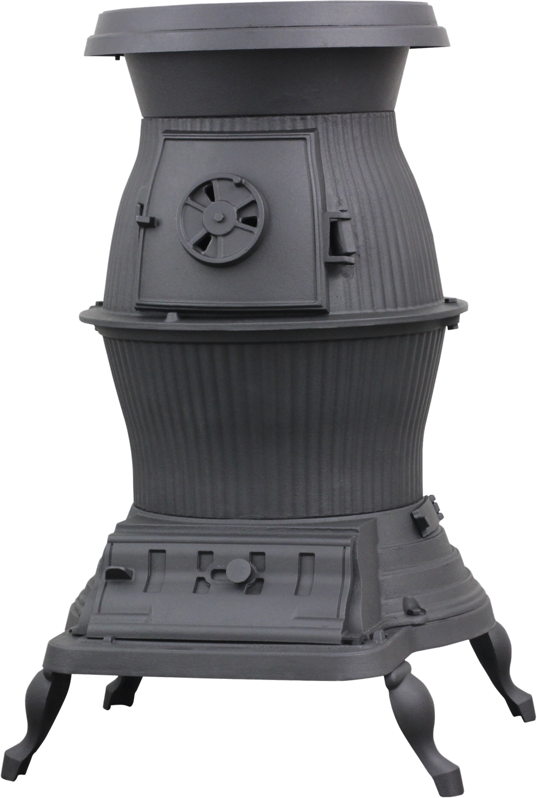 The 1869 Caboose Potbelly Stove is reminiscent of the potbelly stoves seen in the train stations and cabooses of yesteryear. This high performance potbelly stove is constructed of all cast iron and is designed to burn coal. Its generous firepot capacity with shaker grate allows 40 lbs. of coal to burn for eight hours before requiring refueling. Separate ash door with slide draft control at bottom creates a “forge effect” that ensures proper combustion. Long flared top with 8″ lift out lid facilitates fry pan or tea kettle. Stove comes assembled except for legs.